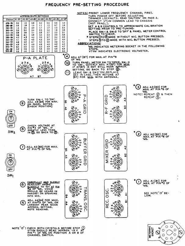 Zum Einsatz unabdingbar ist die Vorabstimmung der beiden bequarzten Kanäle; dieser Vorgang wurde in der Regel durch einen Übermittlungsgerätemechaniker gemäss der Anleitung im hinteren Teil des Handbuchs TM-11-615 (Presetting, an Seite 91) für die beiden Kanäle A und B (zunächst wird auf Kanal A die tiefere Frequenz vorabgstimmt) durchgeführt. Auf der Chassisoberseite finden sich zweimal sieben Trimmer (A1-A7 und B1-B7), zwei Schalter und eine Messbuchse, an dem mit einem Messinstrument (in der Schweiz kam das T-101 zum Einsatz, gemessen werden die Spannungen gegenüber dem Chassis) die entsprechenden Messungen zum Abgleich vorgenommen werden. Vorgegangen wird gemäss der Abgleichanleitung im TM-11-615 resp. der Übersicht im TM-11-310, zunächst werden die Trimmer aufgrund einer Tabelle in die ungefähre Position gebracht, das Geräteinstrument in Position CHECK gebracht. Danach werden die Schritte des Abgleichprozesses durchgearbeitet, die ersten vier Schritte erfolgen im Empfangszustand, die Schritte 5 - 11 mit gedrückter Sendetaste. Zuletzt werden die Schalter SW1 und SW2 auf dem Chassis von der OFF-Position im Abgleichbetrieb wieder in die ON-Position gebracht, das Chassis in das Gerät eingeschoben und das Gerät ist betriebsbereit.