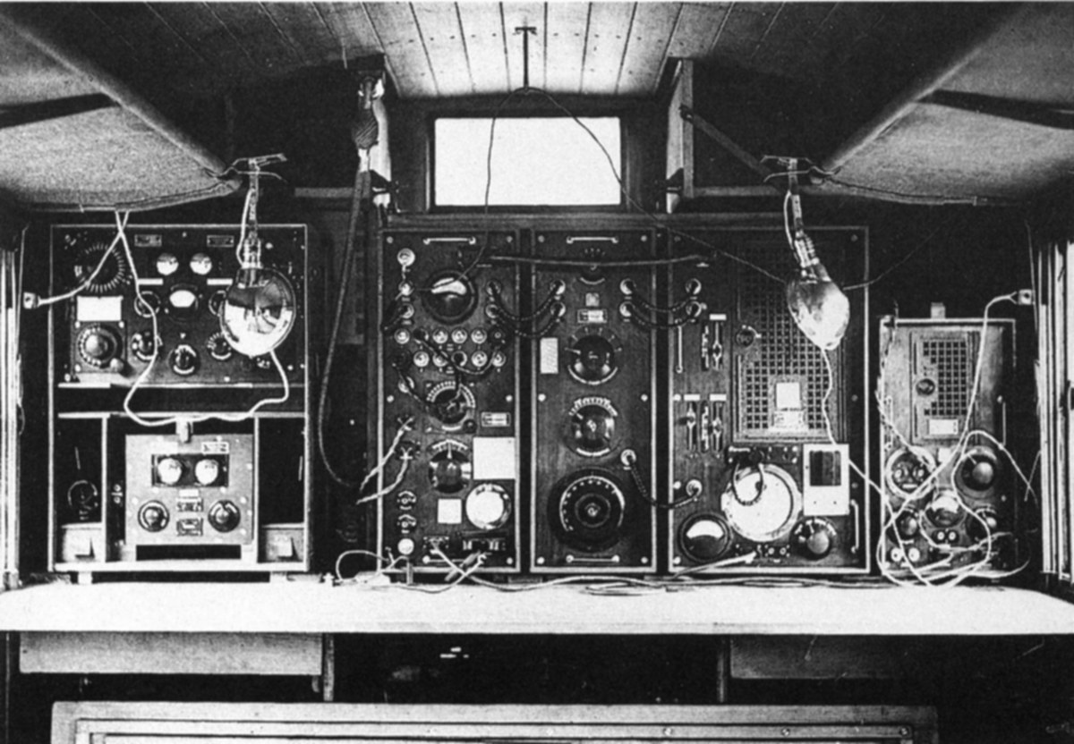 Im Inneren des Stationswagens finden sich linkerhand die Komponenten des Senders, rechts ist der Empfänger Spez 7Bs (E25) mit dem aufgesetzten NF-Verstärker zu erkennen.