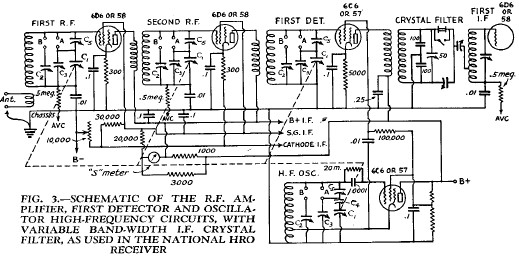 Technically, the HRO is a single conversion superheterodyne with two RF preamplifier stages. The signal coming from the antenna will pass a first tuned circuit of the RF preamplifier (6D6, in the late version HRO-5 6K7) and a second tuned circuit of the RF amplifier stage (6D6, later 6K7). When mixed with the oscillator (6C6, later 6J7) signal in the mixer stage (6C6, later 6J7), the intermediate frequency of 456 kHz is generated. This concept using tuned RF circuits could be realised by National because of their excellent quadruple tuning condensor and the plug in coil sets.