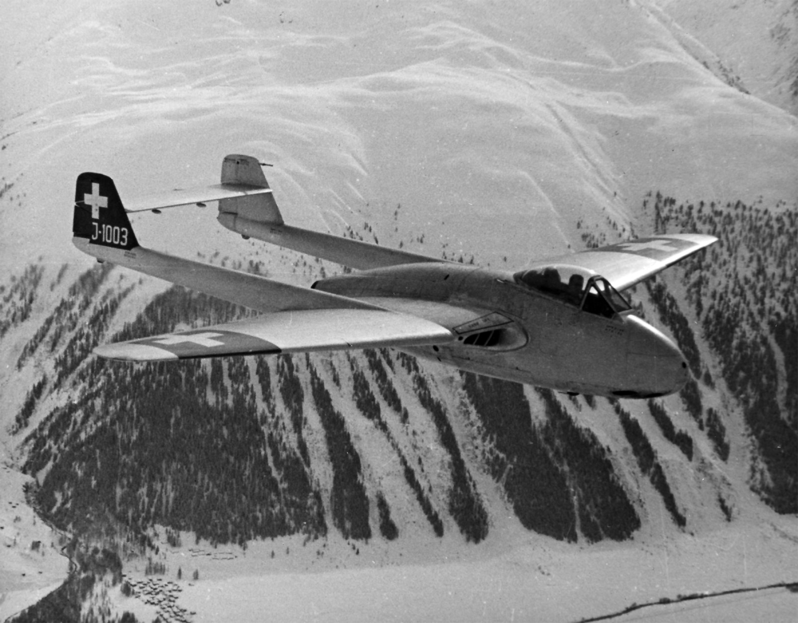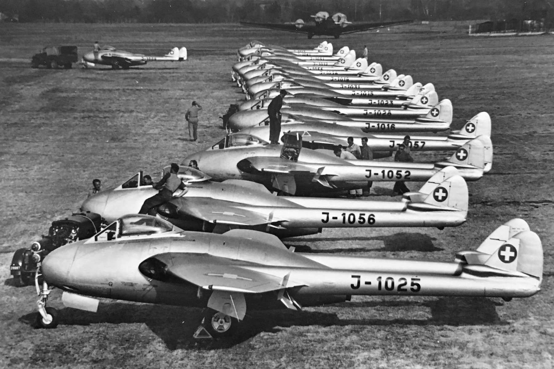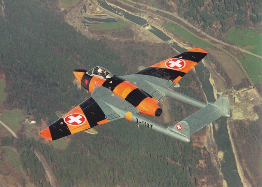 Die De Havilland D.H. 100 Mk 1 wurde im März 1946 von drei Schweizer Piloten in GB-Hatfield erprobt; es wurden drei Versuchsflugzeuge bestellt, von denen leider J-1001 bereits nach einem Monat bei einem Startunfall Totalschaden erlitt und ein Ersatzflugzeug bestellt werden musste.