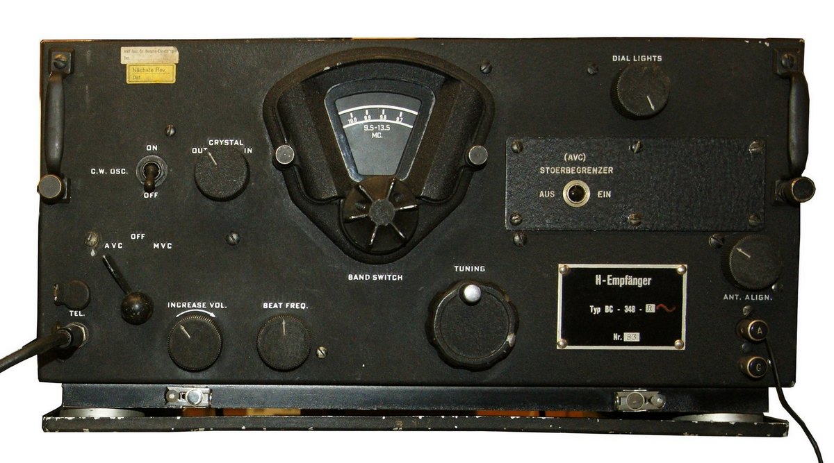 Der Empfänger BC-348, in der Schweizer Version ist teils noch ein Typenschild welches ihn als H-Empfänger ausweist vorhanden, besitzt ein schwarzes Aluminiumgehäuse, er misst 46 x 23 x 22 cm und bringt 20 kg auf die Waage.