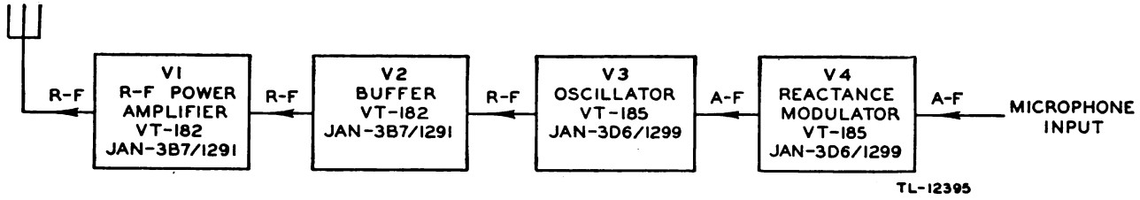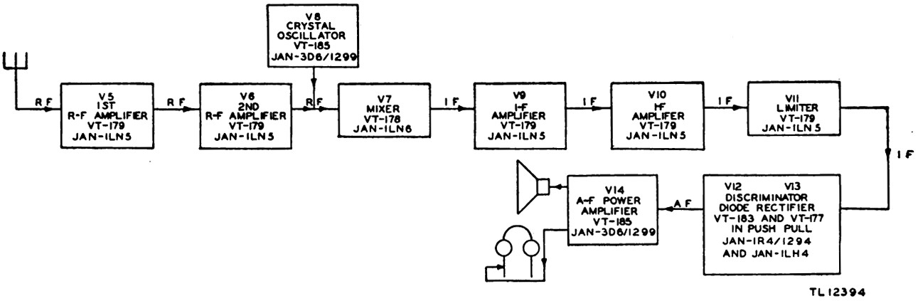 V1 (3B7 (VT-182, 1291), Sende-Endstufe); V2 (3B7 (VT-182, 1291), HF-Verdoppler- und -Vorstufe); V3 (3D6 (VT-185, 1299), HF-Oszillator); V4 (3D6 (VT-185, 1299), Sender-Modulator); V5 (1LN5 (VT-179), 1. HF-Vorstufe); V6 (1LN5 (VT-179), 2. HF-Vorstufe); V7 (1LC6 (VT-178), Empfänger-Mischstufe); V8 (3D6 (VT-185, 1299), Empfänger-Oszillator); V9 (1LN5 (VT-179), 1. ZF-Stufe); V10 (1LN5 (VT-179), 2. ZF-Stufe); V11 (1LN5 (VT-179), Limiter); V12 (1R4 (1294), Empfänger-Diode); V13 (1LH4, Empfänger-Diode / Verstärker); V14 (3D6 (VT-185, 1299), NF-Endstufe).