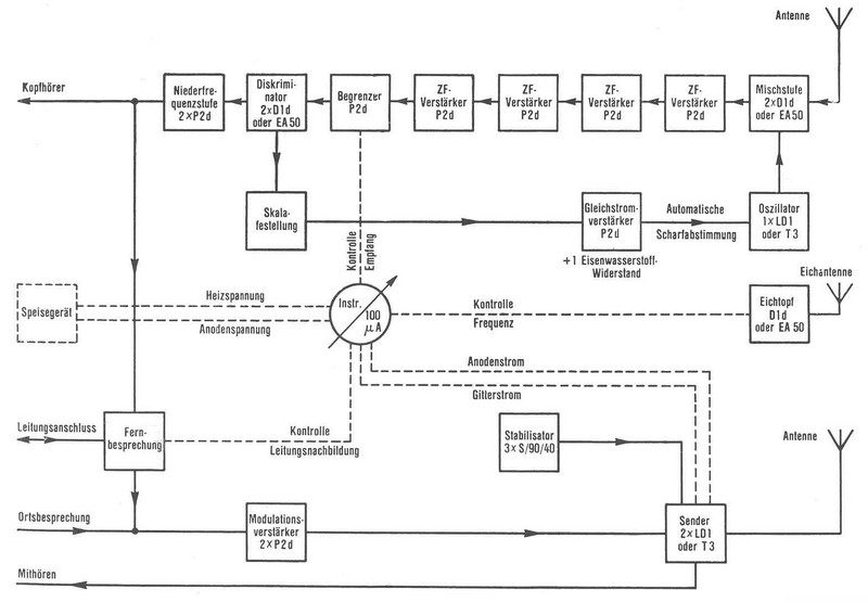 Empfänger: V456, VV457 (EA50, Mischstufe); V458 (LD1, Oszillator); V281, V282, V283, V284 (P2d, 1. bis 4. ZF-Stufe); V285 (P2d, Begrenzer); V286, V287 (zweimal EA50, Diskriminatorstufe); V459 (P2d, automatische Frequenzkorrektur); V160, V161 (zwei P2d, NF-Stufe).