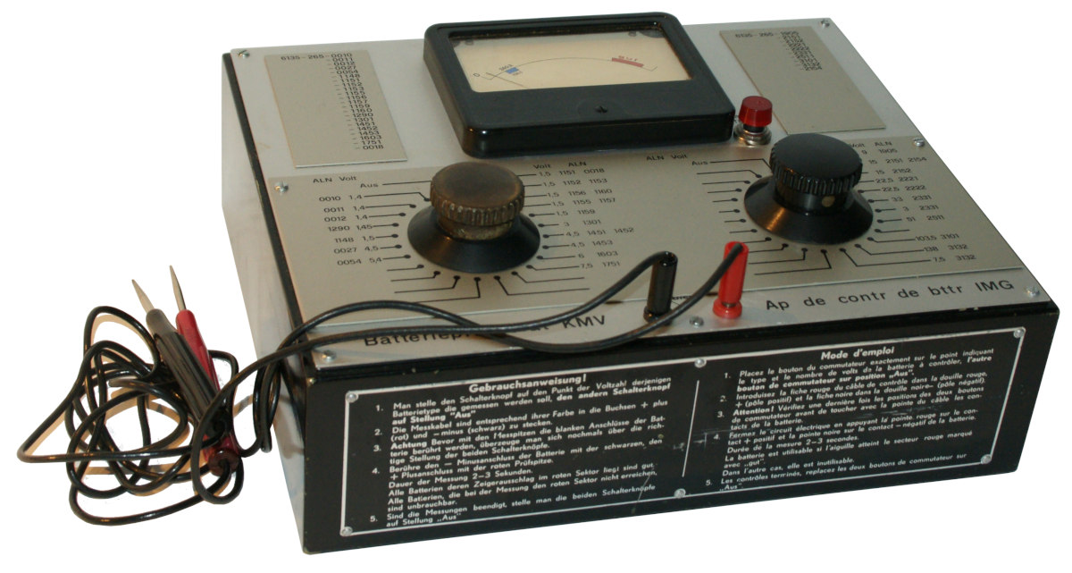 Das Batterieprüfgerät KMV wurde in Zeughäusern und technischen Werkstätten eingesetzt, um Batterien nach dem Rückschub auf Brauchbarkeit zu testen.