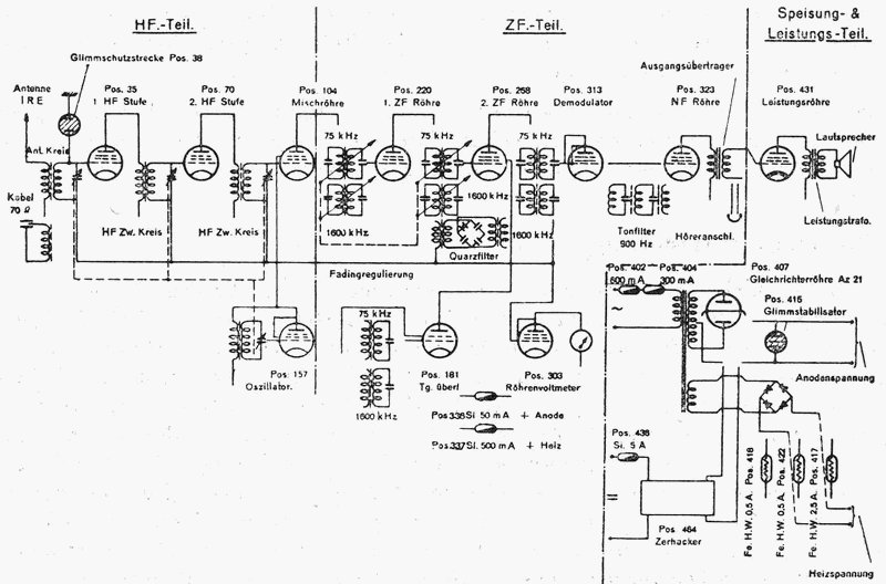 Technisch gelangt das Signal vom Langdrahtantennenanschluss oder dem koaxialen 70 Ohm - Anschluss, der Antenneneingang ist durch eine Glimmschutzstrecke vor schädlichen Überspannungen geschützt, über zwei HF - Verstärkerstufen (D1F, D1F) auf die erste Mischstufe (D1F). Hier wird es mit dem Oszillatorsignal (D1F) auf die Zwischenfrequenz umgesetzt, die in den Lang - / Mittelwellenbereichen bis 2 MHz bei 75 kHz liegt, auf den höheren Frequenzbändern wird auf 1600 kHz umgesetzt. Nach zwei ZF-Verstärkerstufen (D1F, D1F) gelangt das Signal auf den Demodulator (D1F).