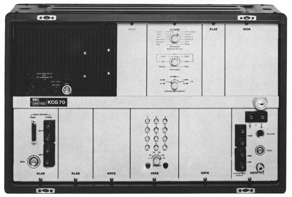 Das Kanal - Chiffriergerät KCG-70 erlaubt die Verschlüsselung von analoger Sprach- oder auch Datenkommunikation über Telephon- und Richtfunkverbindungen und auch die Aufnahme und Wiedergabe von chiffrierten Meldungen über ein Tonbandgerät.