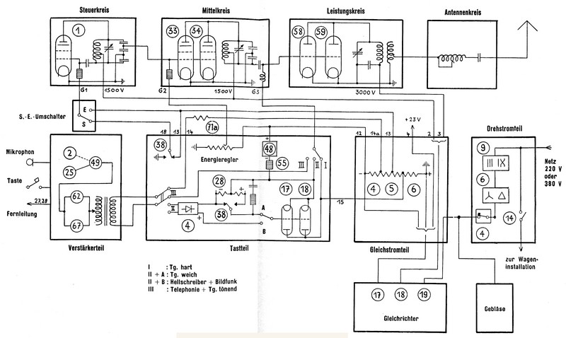 Im Sender arbeitet im Steuerkreis eine Röhre RS337, im Mittelkreis zwei RS337, im Leistungskreis zwei RS329g, im Modulations- und Tastteil zwei RS282 und drei Gleichrichterröhren RGN2504, im (Mikrophon-)Verstärkerteil zwei RS282 und drei Stück RE084k.