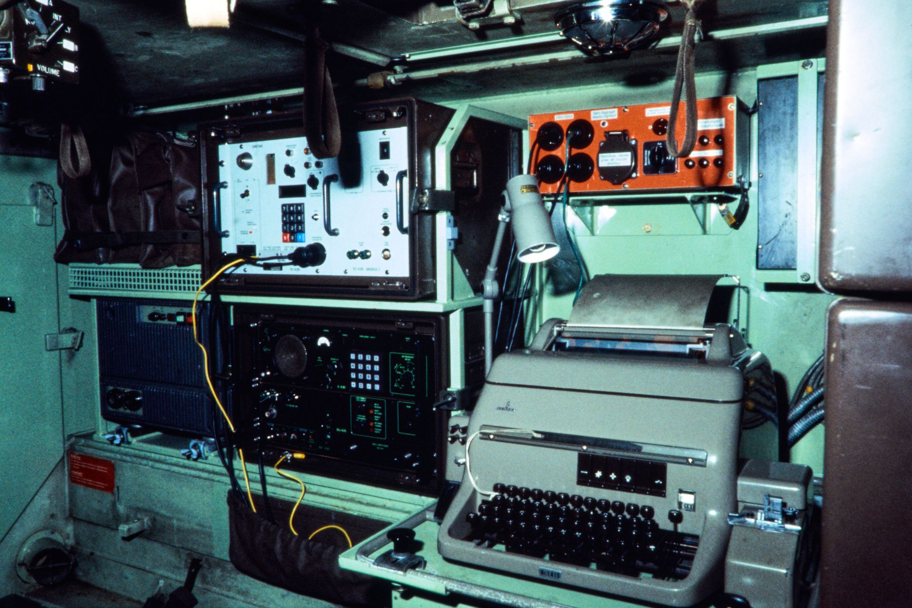- Hinten rechts zwei Telephonleitungsanschlüsse, einer davon für ein Feldtelephon (mit Kabelrolle 500 m) und der zweite für die Fernbetriebsausrüstung