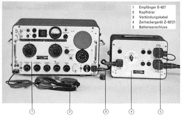 The receiver E-627 has been developed in 1950/51 by Autophon; it was also sold for civilian users and PTT (Swiss post telegraph telephone company) as E76. In parallel, a VHF receiver with a similar construction was developed: the Army designation of this set was E-628, the civilian version E77 sold to the PTT and exported e.g. to Finland.