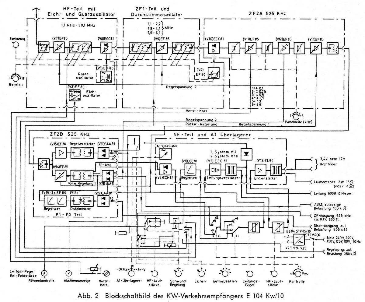 V1 (ECC81, Limiter); V2 (ECC81, AF preamplifier); V3 (EF80, calibrator); V4 (EF80, oscillator); V5 (ECH81, BFO); V6 (EF80, quartz oscillator 1st mixer); V7 (EF85, RF preamplifier); V8 (ECC81, 1st mixer); V9 (EF85, IF amplifier); V10 (ECC81, 2nd mixer stage, IF 525 kHz); V11 - V14 (four EF85, IF amplification); V15 (EF80, variable gain amplifier); V16 / V17 (two EF80, FM limiter); V18 (ECC81, AF amplifier); V19 (EL84, audio final amplifier).