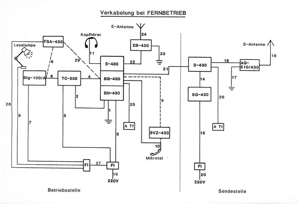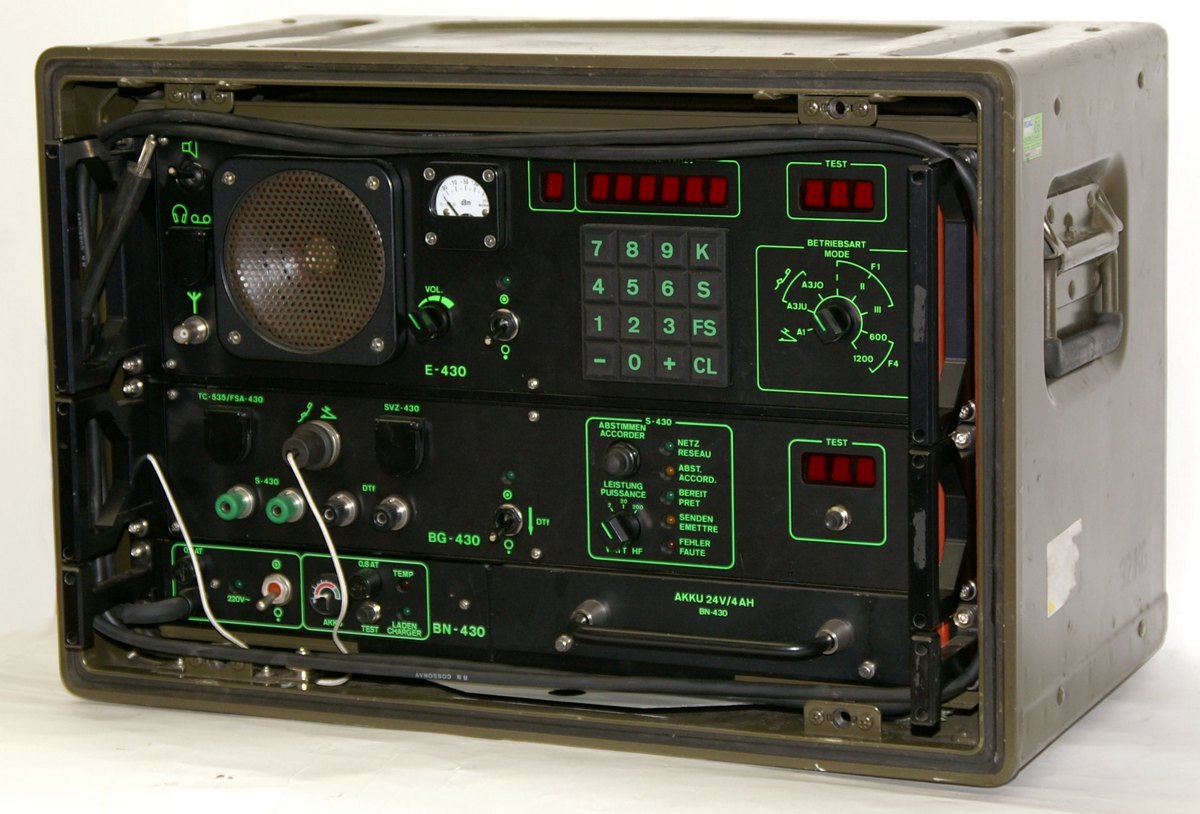 The complete system consists of a Control unit BE-430, to which an encryption device TC-535 and a teletypewriter can be connected. In most cases, the signal is transmitted from a remote site via a remote control cable to transmitter S-430 in a distant location. The automatic antenna tuner AG-510/430 is located at the transmitter site to match the transmitting antenna.