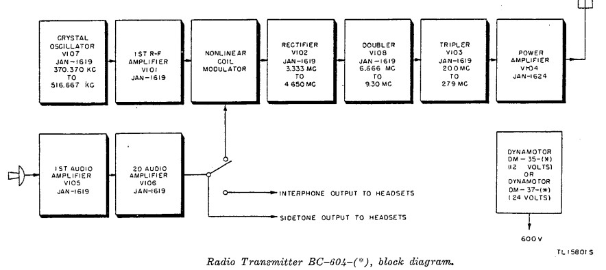 Transmitter BC-604: With the pushbutton unit, the corresponding transmitter crystal (operation frequency is 54 times the crystal frequency) is connected to the transmitting oscillator (V107, 1619). After an RF amplifier stage (V101, 1619), the RF signal is amplified along with the audio signal, coming from the microphone and amplified in two AF amplifier stages (V105, V106, two 1619), and then fed to the modulator coil. The signal rich of harmonics is rectified (V102, 1619) and its twelfth harmonic is filtered out. After a frequency doubler stage (V108, 1619) followed by a frequency tripler stage (V103, 1619), the transmitter output stage tube (V104, 1624) is driven. The operations frequency corresponds to 54 times the transmitter crystal frequency and the output power reaches 30 watts. The signal is fed to the antenna output socket over one of ten pretuned antenna circuits selected by the pushbutton unit.