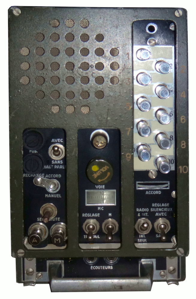 In a bottom row of controls, the (auxiliary) antenna and ground connectors, the switch to tune and operate the set, the switch of the onboard intercom in a tank and the squelch control are located; the squelch threshold is set with the SENSITIVITY control.