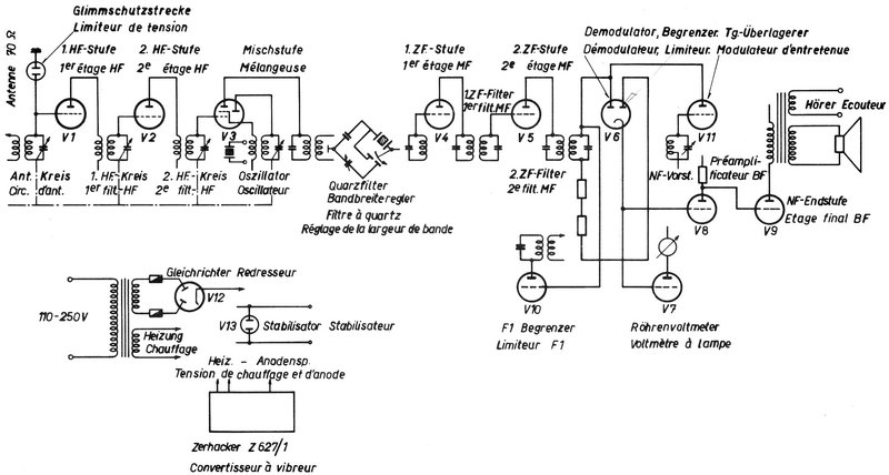 Vom Antenneneingang resp. dem 70 Ohm-Koax-Eingang gelangt das Signal, Überspannungen werden durch eine Glimmlampe abgeleitet, über zwei HF-Verstärkerstufen auf die Mischstufe (ECH42), das Triodensystem arbeitet als selbsterregter oder quarzgesteuerter Oszillator (die Quarzfrequenz muss 455 kHz über der gewünschten Empfangsfrequenz liegen). Die im Mischer generierte Zwischenfrequenz von 455 kHz durchläuft zwei ZF-Verstärkerstufen (EAF42, EAF42), hier wirken das schmale und breite ZF-Filter und das Quarzfilter. Die Demodulatorröhre (EB41) wirkt auch als Störbegrenzer), mit dem Signal des BFO (EF43) ist CW- resp. Einseitenbandempfang möglich. Eine ZF-Begrenzerstufe (EAF42) ist auf der ZF wirksam und stellt das Signal zum FSK-Fernschreibbetrieb an der F1-Buchse (unterhalb des Koax-Antenneneingangs) bereit. Die Niederfrequenz vom Demodulator wird in einem zweistufigen NF-Verstärker auf eine Ausgangsleistung von 1,5 Watt am 15 Ohm-Lautsprecher verstärkt.