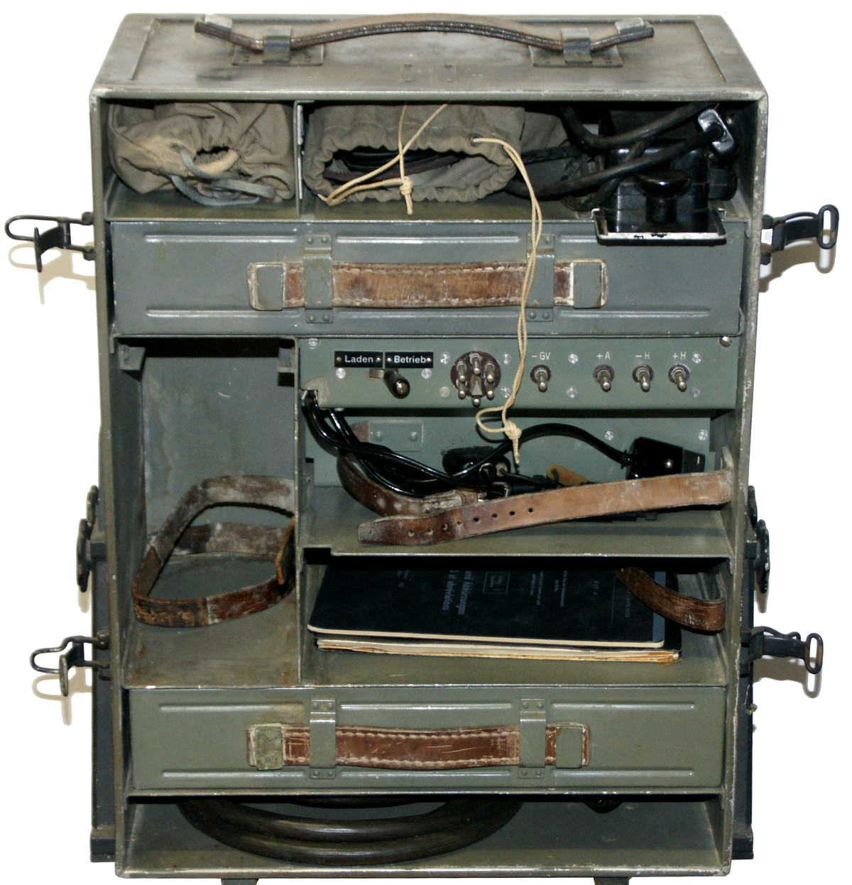 - Das Zubehör, Apparate- und Maschinenkabel, zwei Kopfhörer, Sprechtaste (Sende-Empfangsumschalter mit aufgestecktem Mikrophon) und Morsetaste, ist im Batteriekasten verstaut.