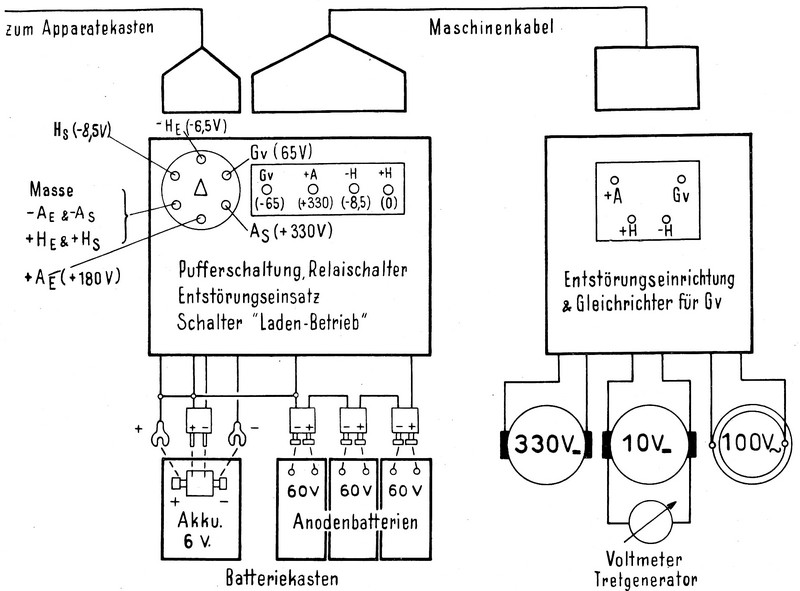 Die Stromversorgung ist ausgesprochen ausgeklügelt. Im Empfangsbetrieb wird der Empfänger vom 6 Volt - NiFe-Heizakku und drei Anodenbatterien zu je 60 V im „Batteriekasten“ versorgt. Sobald der Tretgenerator getreten wird, bewirkt eine Relaisschaltung im Batteriekasten die Umschaltung auf Generatorspeisung. Der Heizakkumulator geht in Pufferbetrieb und heizt weiter die Empfängerröhren, der Empfänger erhält die Anodenspannung direkt vom Tretgenerator, der Sender erhält die Heiz- und Anodenspannungen vom Generator.