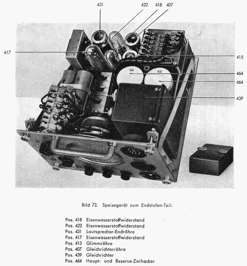 Nach einer NF-Verstärkerstufe, hier wird das Signal für den Kopfhöreranschluss abgegriffen, wird die NF nun ans Zusatzgerät übergeben. In der Endstufe (EBL21) erfolgt die Verstärkung, die Leistung reicht zum Betrieb des Lautsprechers im Speisegerät aus.