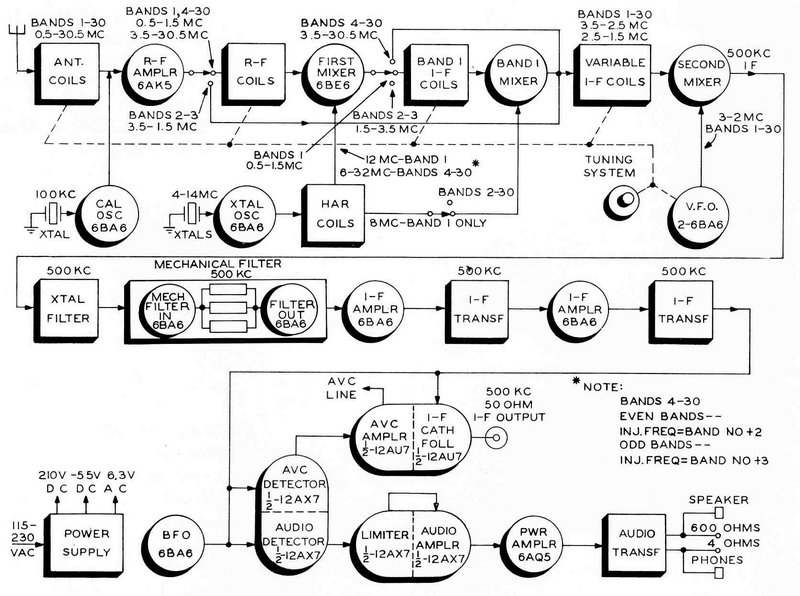 In den weiteren Kurzwellenbereichen von 3,5 - 30,5 MHz arbeitet der Empfänger als Doppelsuper: nach der ersten HF-Verstärkerstufe (V101: 6AK5) wird das Signal in den geraden Frequenzbändern im ersten Mischer (V102: 6BE6) auf 2,5-1,5 MHz umgesetzt, in den ungeraden Frequenz - Bändern auf 2,5-3,5 MHz. Im zweiten Mischer (V106: 6BE6) erfolgt die Umsetzung durch Mischung mit dem 2 - 3 MHz-Signal des hochlinearen VFO (V001: 6BA6; V002: 6BA6) ebenfalls auf die zweite ZF von 500 kHz.
