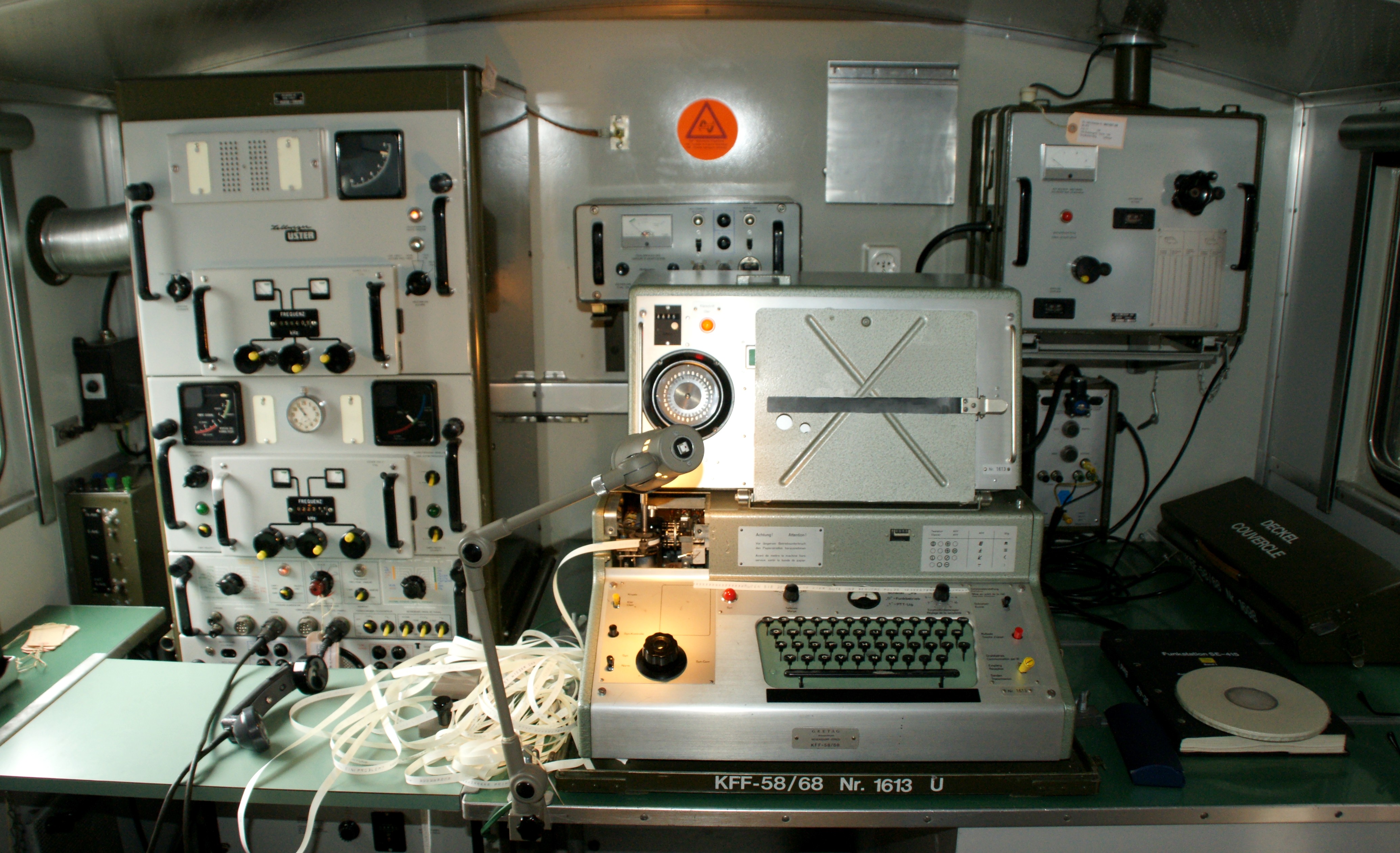 - Dipolantenne 2 x 25 m, Mastbündel für den 12 m Mast sind auf dem Dach des Funkwagens verstaut; das Abstimm - Kontrollgerät verfügt über eine Stehwellen - Messbrücke zur Kontrolle des SWR.