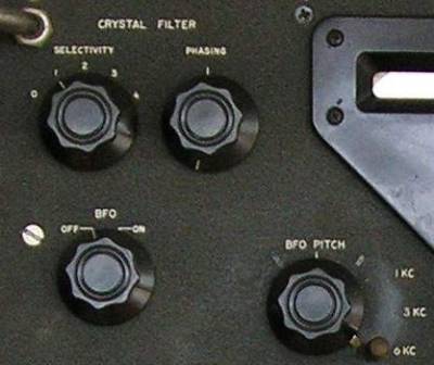 In the left upper corner of the front panel, you find the controls for the crystal filter, the rotary switch activates the BFO used for CW and SSB reception and another knob controls the BFO pitch note. A small metal lever is used to switch the three IF bandwidths of 1,5 / 3 and 6 kHz.