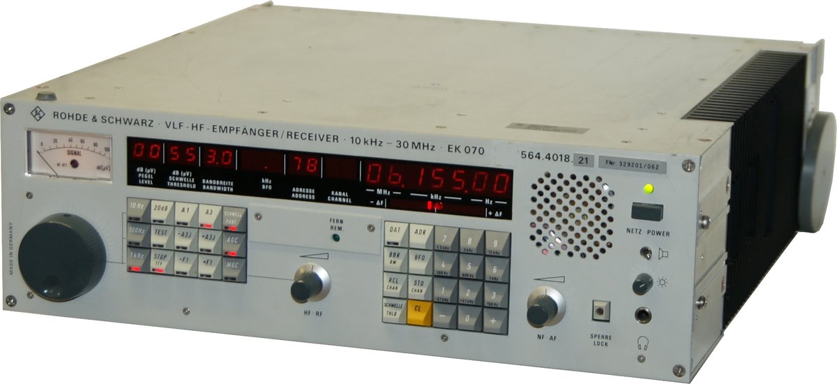 The PLL synthesized VLF - HF all wave receiver Rohde & Schwarz EK070 has been introduced in 1979. It's digital frequency readout has an accuracy of 10 Hz. The R&S EK070 has been one of the earliest shortwave receivers with direct keypad frequency entry, thirty electronic memories and the possibility of beeing remote controlled by a computer or a secondary controller BG 170.